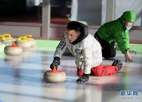 2017年1月9日,在黑龙江省冬季群众体育活动基地,一名小学生在学习掷冰壶。新华社记者 王凯 摄