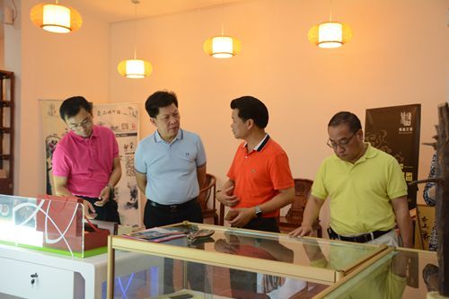 许子汤夫妇(左一、二)和市侨联副主席梁冬晓(右二)参观沉香系列。