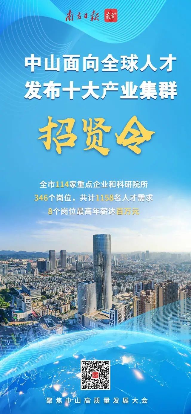 根据招贤令,中山市以十大产业集群企业为主,汇集了全市114家实力雄厚的企业和科研院所共346个岗位的1158名人才需求,面向全球招引海内外优秀人才,这些重点企业包括明阳、康方等10家上市公司,其中有8个岗位年薪高达百万元。